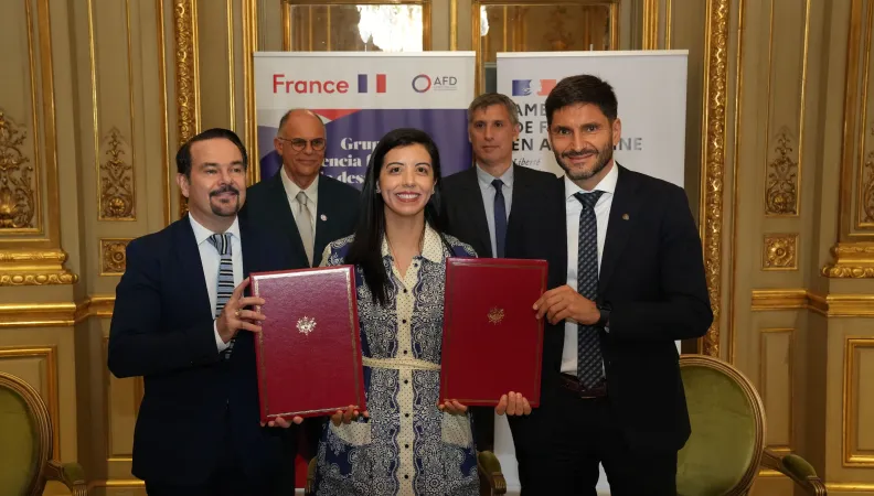 The loan signing ceremony between AFD and the Province of Santa Fe took place at the French Embassy in Buenos Aires, in the presence of Mr. Romain Nadal, French Ambassador to Argentina, Mr. Maximiliano Pullaro, Governor of the Province of Santa Fe, and Ms. Lorena Chara, AFD Director in Argentina.