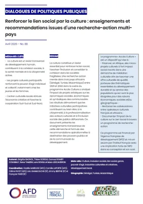 La culture constitue un levier essentiel pour renforcer le lien social, favoriser l’inclusion et consolider la cohésion dans les sociétés fragilisées. Une recherche-action menée dans trois pays africa...